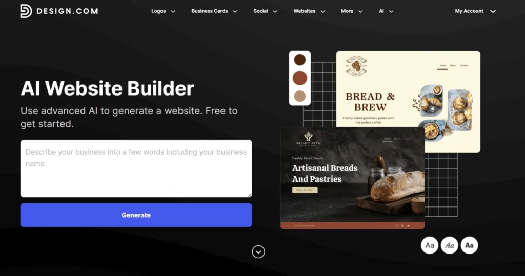 ● Free Plan: Users can get a free website with hosting included. This website is limited to 3 pages, has limited editor access, and a Design.com watermark.
